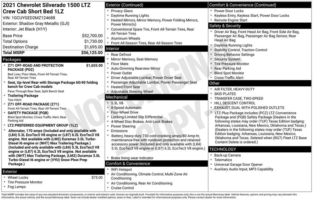 Check out all these great option's LTZ Convenience Package (2 USB Ports (First Row), Floor Mounted Center Console, Power Sliding Rear Window w/Rear Defogger, Universal Home Remote, and Ventilated Driver & Front Passenger Seats), LTZ Plus Package, Preferred Equipment Group 1LZ (10-Way Power Driver Seat w/Lumbar, 10-Way Power Passenger Seat Adjuster w/Lumbar, 12-Volt Rear Auxiliary Power Outlet, 120-Volt Bed Mounted Power Outlet, 120-Volt Instrument Panel Power Outlet, 2 USB Ports, 4.2 Diagonal Color Display Driver Info Center, 4G LTE Wi-Fi Hot Spot Capable, 6-Speaker Audio System, Advanced Trailering System, Auto-Dimming Inside Rear-View Mirror, Auto-Locking Rear Differential, Auxiliary External Transmission Oil Cooler, Bluetooth® For Phone, Chevrolet Connected Access Capable, Chrome Grille, Chrome Mirror Caps, Color-Keyed Carpeting Floor Covering, Compass, Deep-Tinted Glass, Driver Memory, Electric Rear-Window Defogger, Electrical Lock Control Steering Column, Electronic Cruise Control, Front Frame-Mounted Black Recovery Hooks, Front LED Fog Lamps, Front Rubberized Vinyl Floor Mats, HD Rear Vision Camera, Heated Driver & Front Outboard Passenger Seats, Heated Steering Wheel, Hitch Guidance w/Hitch View, Integrated Trailer Brake Controller, Keyless Open & Start, Leather Wrapped Steering Wheel, LED Cargo Area Lighting, Manual Tilt/Telescoping Steering Column, OnStar & Chevrolet Connected Services Capable, Outside Heated Power-Adjustable Mirrors, Power Door Locks, Power Front Passenger Windows w/Express Up/Down, Power Front Windows w/Driver Express Up/Down, Power Rear Windows w/Express Down, Power Tailgate, Rear Dual USB Charging-Only Ports, Rear Rubberized-Vinyl Floor Mats, Rear Wheelhouse Liners, Remote Vehicle Starter System, SiriusXM w/360L, Standard Tailgate, Steering Wheel Audio Controls, Theft Deterrent System (Unauthorized Entry), and Wireless Phone Projection), Safety Package (Lane Change Alert w/Side Blind Zone Alert, Perimeter Lighting, Rear Cross Traffic Alert, and Ultrasonic Front & Rear Park Assist), Trailering Package (Hitch Guidance), Up-Level Rear Seat w/Storage Package, Z71 Off-Road & Protection Package (All-Weather Floor Liner (LPO) (AAK) and Chevytec Spray-On Black Bedliner), Z71 Off-Road Package (Dual Exhaust w/Polished Outlets, Heavy-Duty Air Filter, Hill Descent Control, and Off-Road Suspension), 8-Speed Automatic, 4WD, Jet Black Leather, 170 Amp Alternator, 3.23 Rear Axle Ratio, 4-Wheel Disc Brakes, 6 Speakers, ABS brakes, Air Conditioning, Alloy wheels, AM/FM radio: SiriusXM with 360L, Apple CarPlay/Android Auto, Auto-dimming door mirrors, Auto-dimming Rear-View mirror, Automatic temperature control, Brake assist, Bumpers: chrome, Delay-off headlights, Driver door bin, Driver vanity mirror, Dual front impact airbags, Dual front side impact airbags, Electronic Stability Control, Front anti-roll bar, Front Bucket Seats, Front Center Armrest w/Storage, Front dual zone A/C, Front fog lights, Front reading lights, Front wheel independent suspension, Fully automatic headlights, Garage door transmitter, Heated door mirrors, Heated front seats, Heated steering wheel, Heavy Duty Suspension, Illuminated entry, Low tire pressure warning, Memory seat, Occupant sensing airbag, Outside temperature display, Overhead airbag, Overhead console, Panic alarm, Passenger door bin, Passenger vanity mirror, Perforated Leather-Appointed Front Seat Trim, Power door mirrors, Power driver seat, Power passenger seat, Power steering, Power windows, Premium audio system: Chevrolet Infotainment 3 Plus, Radio data system, Radio: Chevrolet Infotainment 3 Plus System, Rear reading lights, Rear seat center armrest, Rear step bumper, Rear window defroster, Remote keyless entry, Security system, Speed control, Speed-sensing steering, Split folding rear seat, Steering wheel mounted audio controls, Tachometer, Telescoping steering wheel, Tilt steering wheel, Traction control, Trip computer, Vari