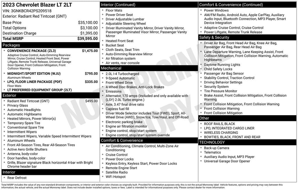 Check out all these great option's Convenience Package (Adaptive Cruise Control, Black Roof-Mounted Side Rails, Enhanced Automatic Emergency Braking, Heated Driver & Front Passenger Seats, Inside Rear-View Auto-Dimming Mirror, Rear Power Programmable Liftgate, Universal Home Remote, and Wireless Charging), Floor Liner Package (LPO) (1st & 2nd Row All-Weather Floor Liners (LPO) and Integrated Cargo Liner (LPO)), Midnight/Sport Edition (Front & Rear Black Bowties and Wheels: 18 High Gloss Black Painted Aluminum), Preferred Equipment Group 2LT, 170 Amp Alternator, 3.47 Final Drive Axle Ratio, 4-Way Manual Front Passenger Seat Adjuster, 4-Wheel Disc Brakes, 6 Speakers, 6-Speaker Audio System Feature, 8-Way Power Driver Seat Adjuster, ABS brakes, Air Conditioning, Alloy wheels, AM/FM radio: SiriusXM with 360L, Apple CarPlay/Android Auto, Auto High-beam Headlights, Automatic temperature control, Brake assist, Bumpers: body-color, Child-Seat-Sensing Airbag, Compass, Delay-off headlights, Driver door bin, Driver vanity mirror, Dual front impact airbags, Dual front side impact airbags, Electronic Stability Control, Emergency communication system: OnStar and Chevrolet connected services capable, Four wheel independent suspension, Front anti-roll bar, Front Bucket Seats, Front Center Armrest, Front dual zone A/C, Front reading lights, Fully automatic headlights, Heated door mirrors, Illuminated entry, Knee airbag, Leather Shift Knob, Low tire pressure warning, Occupant sensing airbag, Outside temperature display, Overhead airbag, Overhead console, Panic alarm, Passenger door bin, Passenger vanity mirror, Power door mirrors, Power Driver Lumbar Control, Power driver seat, Power steering, Power windows, Premium audio system: Chevrolet Infotainment 3 Plus, Premium Cloth Seat Trim, Radio data system, Radio: Chevrolet Infotainment 3 Plus System, Rear anti-roll bar, Rear reading lights, Rear seat center armrest, Rear window defroster, Rear window wiper, Remote keyless entry, Ride & Handling Suspension, Security system, SiriusXM w/360L, Speed control, Speed-sensing steering, Split folding rear seat, Spoiler, Steering wheel mounted audio controls, Tachometer, Telescoping steering wheel, Tilt steering wheel, Traction control, Trip computer, Variably intermittent wipers, Voltmeter, and Wheels: 18 Grazen Metallic Aluminum. Whether you are looking to get into a brand new or pre-owned vehicle, we can customize everything to fit into your budget and make it affordable for you. We specialize in financing. If you have perfect credit or are looking to establish or rebuild your credit, we will help you find the best financing rates possible. We have even have first time buyer programs! Even if this is you first vehicle, you can trust our team at Fosterâs to help you find the perfect vehicle to fit your needs. We look forward to working with you!