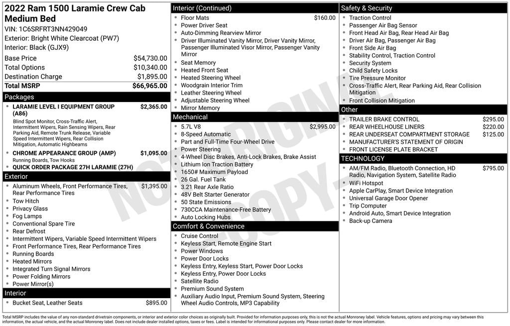 Check out all these great option's Chrome Appearance Group (Bright Day Light Opening Moldings, Chrome Tow Hooks, and Wheel to Wheel Side Steps), Laramie Level I Equipment Group (2nd Row In Floor Storage Bins, Auto High Beam Headlamp Control, Blind Spot & Cross Path Detection, Foam Bottle Insert (Door Trim Panel), ParkSense Front/Rear Park Assist w/Stop, Rain Sensitive Windshield Wipers, and Remote Tailgate Release), Quick Order Package 27H Laramie, #1 Seat Foam Cushion, 10 Speakers, 3 Rear Seat Head Restraints, 3.21 Rear Axle Ratio, 4 Way Front Headrests, 4-Wheel Disc Brakes, 48V Belt Starter Generator, 4G LTE Wi-Fi Hot Spot, 8.4 Touchscreen Display, ABS brakes, Adjustable pedals, Air Conditioning, All R1 High Radios, All Radio Equipped Vehicles, Alloy wheels, AM/FM radio: SiriusXM, Apple CarPlay, Apple CarPlay/Android Auto, Audio memory, Auto-dimming door mirrors, Auto-Dimming Exterior Driver Mirror, Auto-dimming Rear-View mirror, Automatic temperature control, Brake assist, Bumpers: chrome, Chrome Exterior Mirrors, Compass, Connected Travel & Traffic Services, Connectivity - US/Canada, Convex Wide-Angle Mirror Insert, Delay-off headlights, Disassociated Touchscreen Display, Driver door bin, Driver Seat Memory, Driver vanity mirror, Dual front impact airbags, Dual front side impact airbags, Electronic Stability Control, Exterior Mirrors Courtesy Lamps, Exterior Mirrors w/Heating Element, Exterior Mirrors w/Memory, Exterior Mirrors w/Supplemental Signals, For Details, Visit DriveUconnect.com, For More Info, Call 800-643-2112, Front anti-roll bar, Front Center Armrest w/Storage, Front dual zone A/C, Front fog lights, Front License Plate Bracket, Front reading lights, Front Seat Back Map Pockets, Front wheel independent suspension, Fully automatic headlights, Garage door transmitter, Global Telematics Box Module (TBM), Google Android Auto, GPS Antenna Input, GPS Navigation, HD Radio, Heated door mirrors, Heated Front Seats, Heated front seats, Heated Steering Wheel, Heated steering wheel, Heavy-Duty Engine Cooling, Illuminated entry, Integrated Center Stack Radio, Integrated Voice Command w/Bluetooth, Leather steering wheel, Leather Trim 40/20/40 Bench Seat, Low tire pressure warning, Manufacturer's Statement of Origin, Memory seat, MOPAR Front & Rear Rubber Floor Mats, Occupant sensing airbag, Outside temperature display, Overhead airbag, Overhead console, Panic alarm, ParkView Rear Back-Up Camera, Passenger door bin, Passenger vanity mirror, Pedal memory, Power 2-Way Driver Lumbar Adjust, Power 2-Way Passenger Lumbar Adjust, Power 8-Way Driver & Passenger Seats, Power door mirrors, Power driver seat, Power passenger seat, Power steering, Power windows, Power-Folding Mirrors, Radio data system, Radio: Uconnect 5 Nav w/8.4 Display, Radio: Uconnect 5 W w/8.4 Display, Rear 60/40 Folding Seat, Rear anti-roll bar, Rear seat center armrest, Rear step bumper, Rear Underseat Compartment Storage (DISC), Rear Wheelhouse Liners, Rear window defroster, Remote keyless entry, Security system, SiriusXM Radio Service, SiriusXM w/360L, Speed control, Split folding rear seat, Steering wheel mounted audio controls, Tachometer, Telescoping steering wheel, Tilt steering wheel, Traction control, Trailer Brake Control, Trip computer, Turn signal indicator mirrors, USB Host Flip, Variably intermittent wipers, Ventilated Front Seats, Ventilated front seats, Voltmeter, Wheels: 18 x 8 Aluminum Base Painted, and Wheels: 20 x 9 Premium Paint/Polished. Whether you are looking to get into a brand new or pre-owned vehicle, we can customize everything to fit into your budget and make it affordable for you. We specialize in financing. If you have perfect credit or are looking to establish or rebuild your credit, we will help you find the best financing rates possible. We have even have first time buyer programs! Even if this is you first vehicle, you can trust our team at Fosterâs to help you find the perfect ve